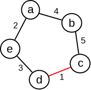 Razmotrimo primer grafa sa slike ??. Grana \((c,d)\) je grana minimalne težine u grafu, i ako nju uklonimo i problem svedemo na traženje minimalnog povezujućeg drveta u grafu \(G\) bez grane \((c,d)\), dobijamo da njega čine sve ostale grane grafa: grane \((d,e), (e,a), (a,b)\) i \((b,c)\). Dodavanjem grane \((c,d)\) u ovo minimalno povezujuće drvo dobijamo ciklus, a znamo da ciklus ne može biti deo minimalnog povezujućeg drveta.